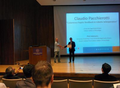La tesi di dottorato di Claudio Pacchierotti, studente dell'Università di Siena e dell'Istituto Italiano di Tecnologia, è stata giudicata la miglior tesi nel mondo nel campo dell'aptica. Durante il convegno "IEEE World Haptics 2015", tenutosi a Chicago (Stati Uniti) dal 22 al 26 Giugno, Claudio Pacchierotti è stato insignito del prestigioso premio da una commissione internazionale formata dai più importanti ricercatori dei settori dell'aptica e della robotica. La tesi di dottorato, intitolata "Cutaneous haptic feedback in robotic teleoperation", tratta del ruolo fondamentale del ritorno di forza di tipo tattile nei sistemi di teleoperazione robotica. Questo tipo di ritorno di forza, infatti, combina alte prestazioni con l'assoluta sicurezza del sistema robotico. La tesi valuta questo innovativo approccio alla teleoperazione in molteplici applicazioni e scenari. Da menzionare è l'applicazione per la chirurgia robotica. Ad oggi, infatti, il chirurgo che opera utilizzando un sistema robotico, non è in grado di percepire, tramite il suo senso del tatto, quanta forza il robot sta applicando sul tavolo operatorio, perdendo importanti informazioni relative alla consistenza e durezza dei tessuti manipolati (come se il chirurgo operasse con i guanti). Nella tesi premiata, invece, Pacchierotti propone un innovativo sistema di forza tattile che rende il chirurgo capace di percepire le forze con cui il robot interagisce con i tessuti, sempre garantendo l'assoluta sicurezza dell'operazione. Il sistema è stato implementato su un robot chirurgico da Vinci e testato con un esperimento di palpazione su un modello di cuore. Le prestazioni del sistema con ritorno di forza tattile sono risultate dell'80% superiori a quelle dei sistemi oggi disponibili. Altre applicazioni presentate nella tesi riguardano la manipolazione di aghi flessibili per biopsia e la manipolazione industriale. La tesi è stata completata sotto la supervisione del Prof. Domenico Prattichizzo e del Prof. Darwin G. Caldwell, dell'Università di Siena e dell'Istituto Italiano di Tecnologia, in collaborazione con l'Università della Pennsylvania (Stati Uniti), l'Università di Twente (Paesi Bassi) e l'Università di Padova (Italia). Claudio Pacchierotti ha conseguito nel Dicembre 2014 il Dottorato di Ricerca presso il Dipartimento di Ingegneria dell'Informazione e Scienze Matematiche dell'Università degli Studi di Siena ed è attualmente un ricercatore postdoc presso l'Istituto Italiano di Tecnologia.